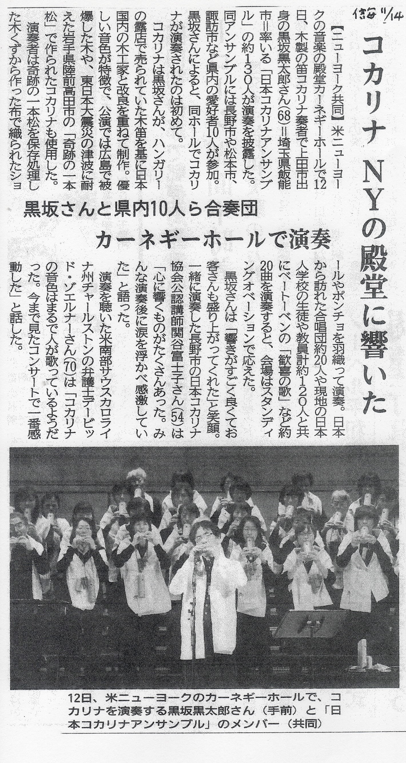 【続報】コカリナ奏者の黒坂黒太郎さん(66期)が率いる日本人130名がニューヨークのカーネギーホールで演奏会を開きましたが信濃毎日新聞でも報道されました(田口博(66期))。